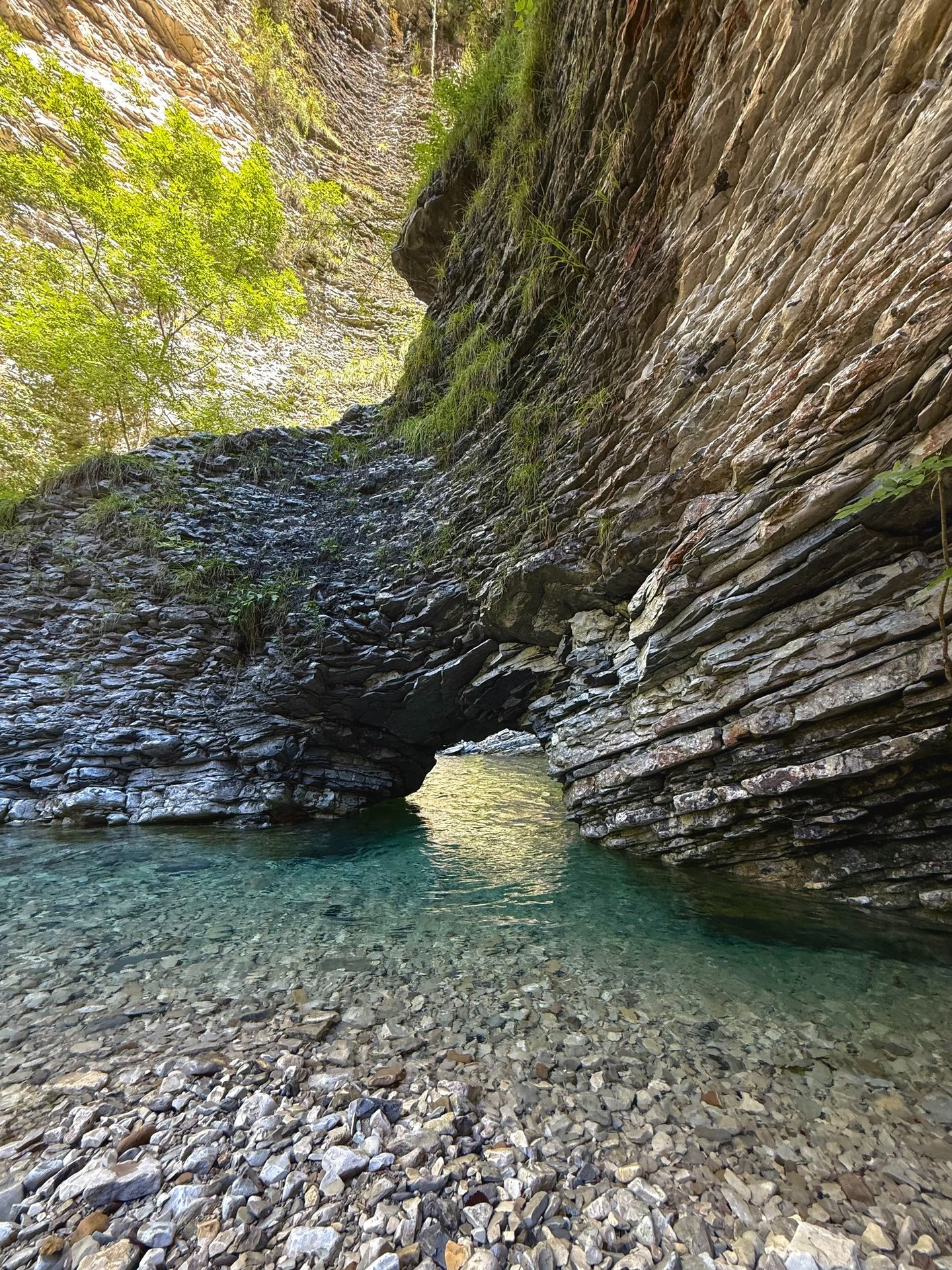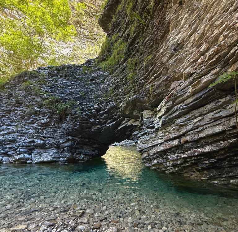 Una gola profonda scavata dal torrente Ardo nel corso di millenni, oggi asciutta ma viva di luce e ombra.