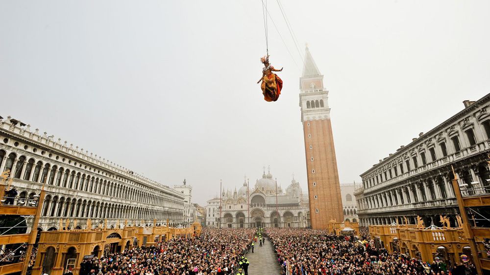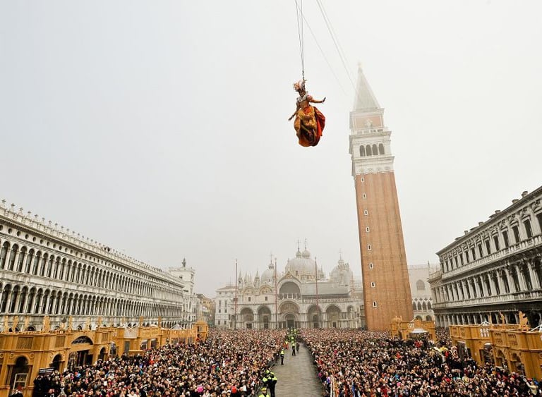 The most anticipated spectacle is undoubtedly the Flight of the Angel, the ceremonial event that officially marks the beginning of the celebrations in the heart of St. Mark’s Square.