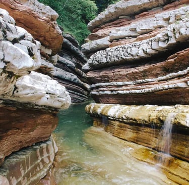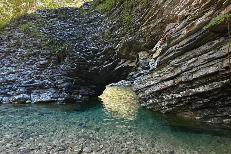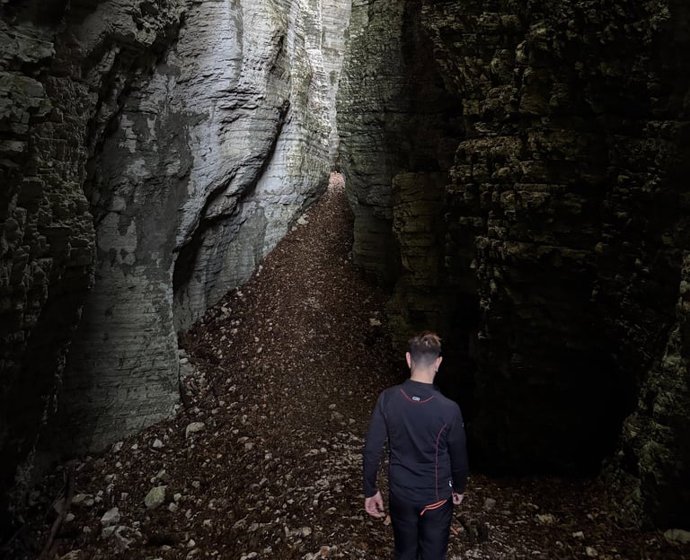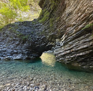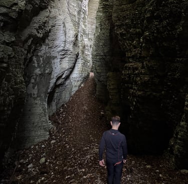 A natural chasm carved by the Ardo stream over thousands of years — now dry, yet alive with light and shadow.