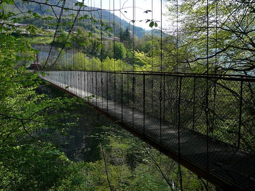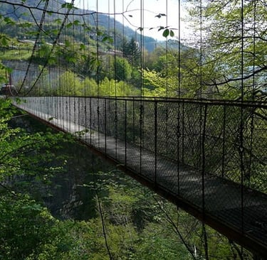 The Igne Suspension Bridge is a 150-meter pedestrian walkway hanging 60 meters above the Maè valley.