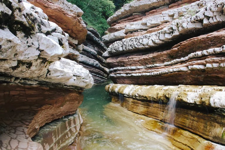 Crystal-clear water flows step by step along limestone walls, creating shades from ice-blue to deep green.