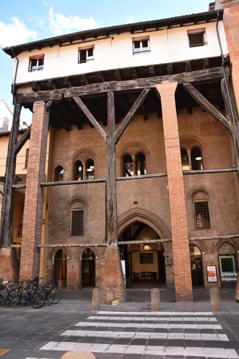 Look up beneath the wooden portico of Corte Isolani, between Strada Maggiore and Via Santo Stefano, and you might spot three arrows lodged in the ceiling beams.