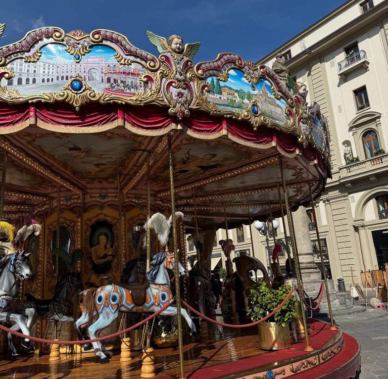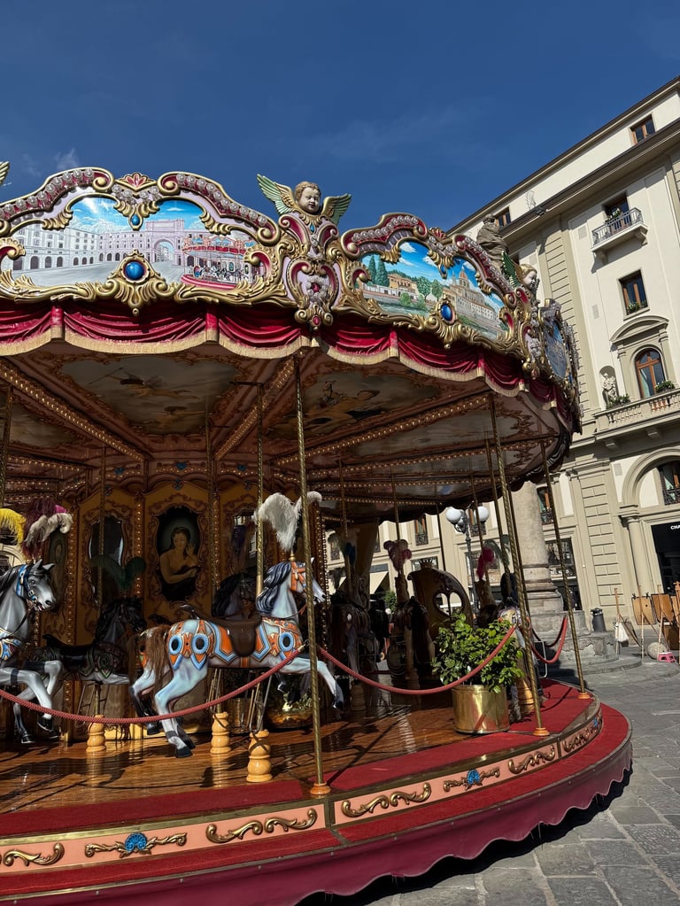 La strada scende e si fa moderna, piena di voci e vetrine, e all’improvviso il ritmo si allarga di nuovo nella Piazza della Repubblica, elegante, simmetrica, teatrale. Una giostra gira da anni, lenta, colorata, come un ricordo dell’infanzia rimasto sospeso. Tavolini all’aperto, tazzine lucide, musicisti di strada, lampade appese tra i caffè storici: la piazza sembra una fotografia vintage, una di quelle che non ha bisogno di filtri.