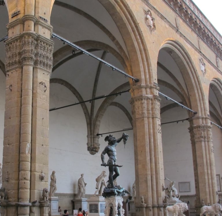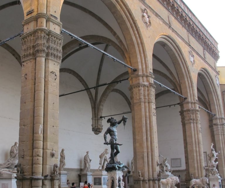 Il Palazzo Vecchio si alza dietro tutto, solido e severo, con la Torre di Arnolfo che taglia il cielo. La loggia di pietra disegna archi che sembrano cornici teatrali e ogni scultura sotto di essi è illuminata come un attore sul palco. La Loggia dei Lanzi non è un museo: è una scena, aperta, viva, perfetta.