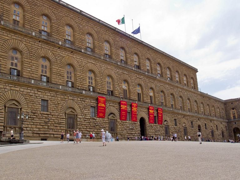 Pochi passi e il Palazzo Pitti si solleva davanti alla piazza: enorme, severo, quasi ciclopico. I mattoni sembrano muscoli tesi, la facciata è un muro che non finisce. Il cortile interno è un teatro, e la città qui sembra respirare diversamente, più lenta, più regale.