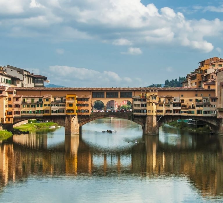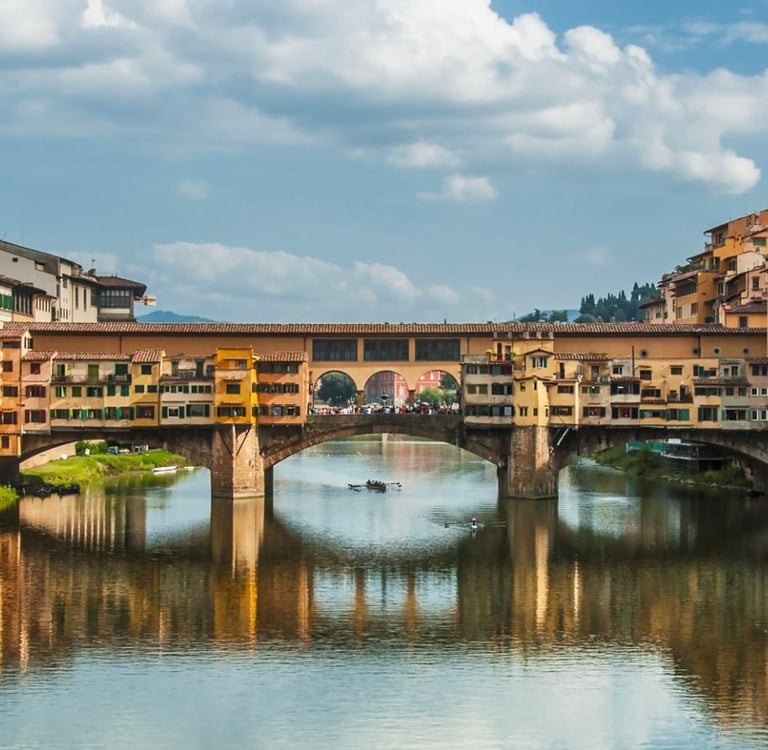Il Ponte Vecchio si stende come un sorriso di case colorate: botteghe sospese, finestre piccole, luci gialle quando il sole scende. Qui ogni tramonto è irresistibile; tutti tirano fuori la fotocamera, ma nessuno riesce a portar via davvero la magia.
