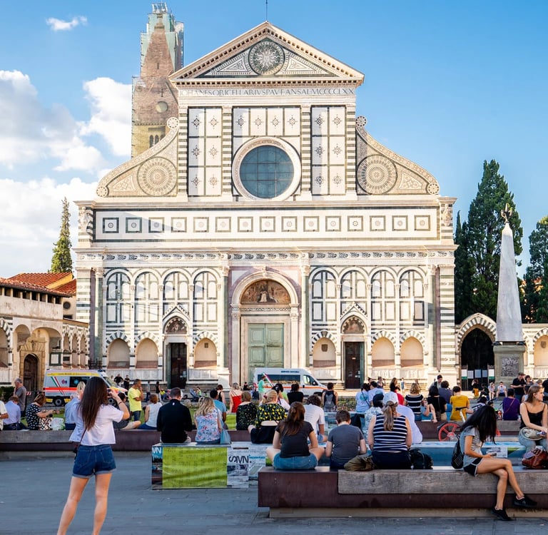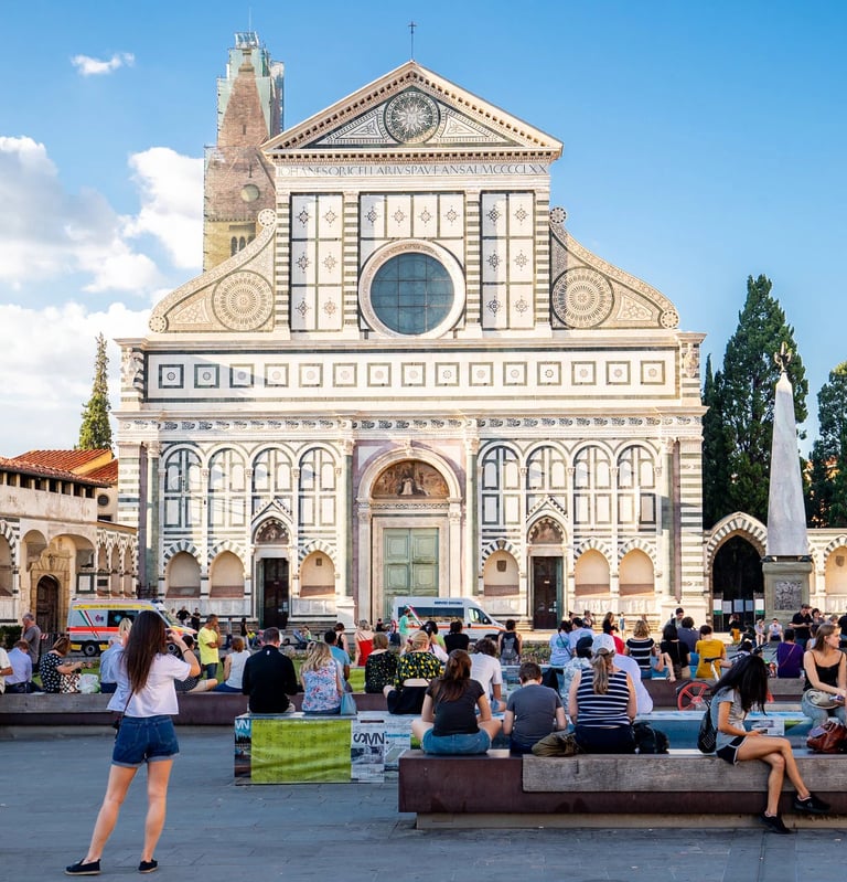 La piazza fuori è grande, luminosa: Santa Maria Novella si apre come una tela geometrica.