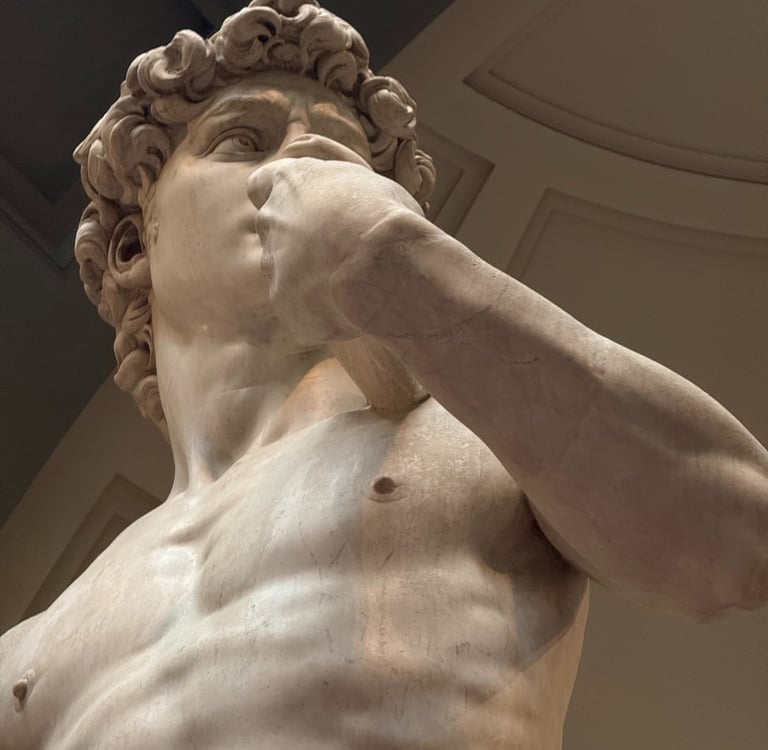 Dentro, il tempo si stringe. Le statue avanzano come persone reali, la luce scende dall’alto e cade sulle spalle del David, che non si muove ma sembra respirare. I turisti si immobilizzano davanti al gigante, e per un minuto nessuno parla. È una fotografia senza scatto, un’immagine che resta anche quando si esce di nuovo nella strada.