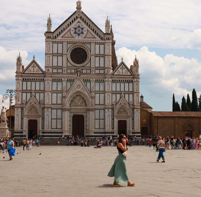 E poi si allarga lo spazio. La piazza si apre tutta insieme, enorme, luminosa, e la Basilica di Santa Croce appare con la sua facciata bianca e perfetta, come fosse stata disegnata ieri. Non servono parole: bastano le geometrie, i marmi, il contrasto con il cielo. Da un lato le biciclette parcheggiate in disordine, dall’altro i turisti seduti sui gradini, come in una scenografia costruita apposta per essere ripresa.